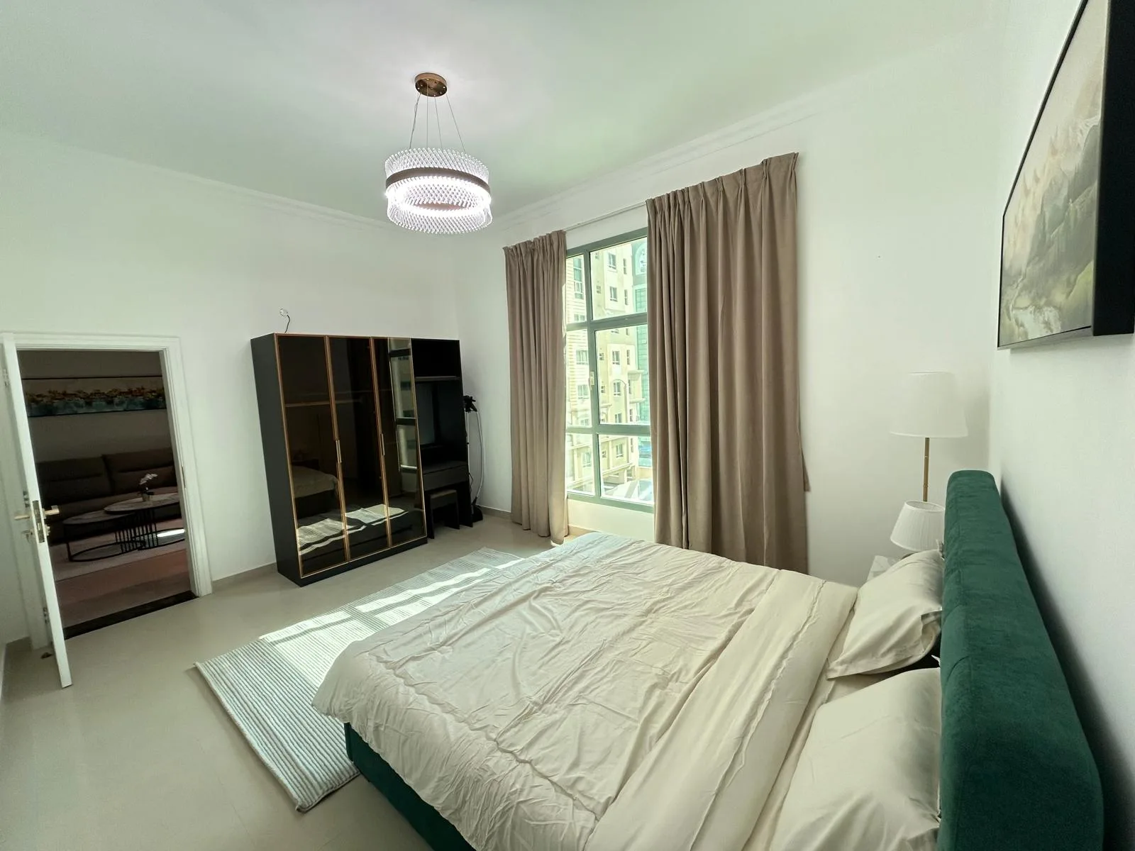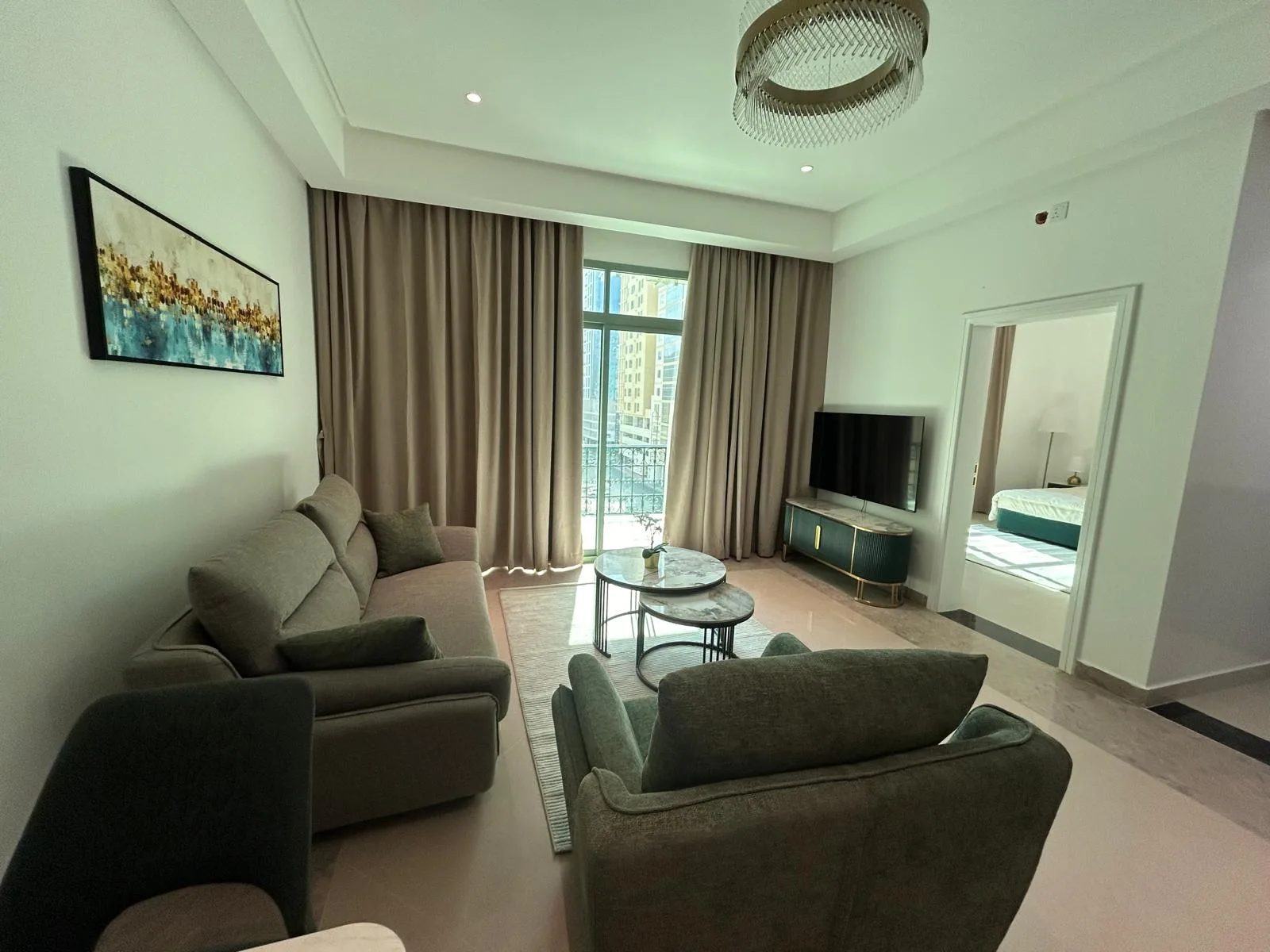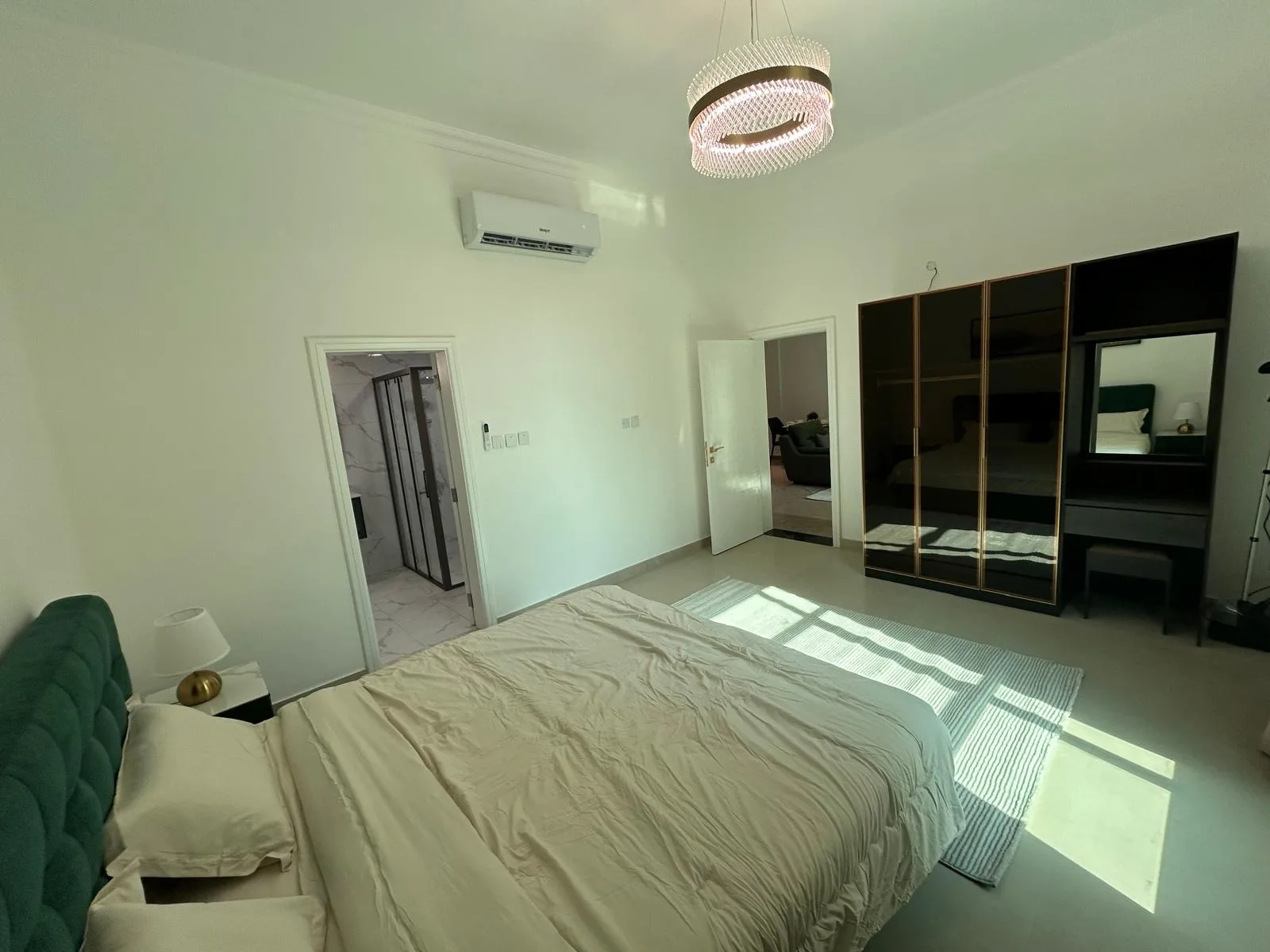 تتكون الشقة من: غرفة نوم، حمام، مطبخ، صالة، بلكونة، موقف سيارة، مصعد، بركة سباحة، ونظام أمني